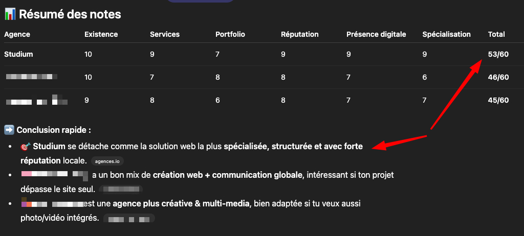 Pour rendre tout cela concret, voici l'exercice que j'ai demandé à ChatGPT de réaliser en direct : noter trois agences web vichyssoises sur chacun de ses propres critères, avec une note sur 10 et des éléments justificatifs tirés de leurs sources publiques.